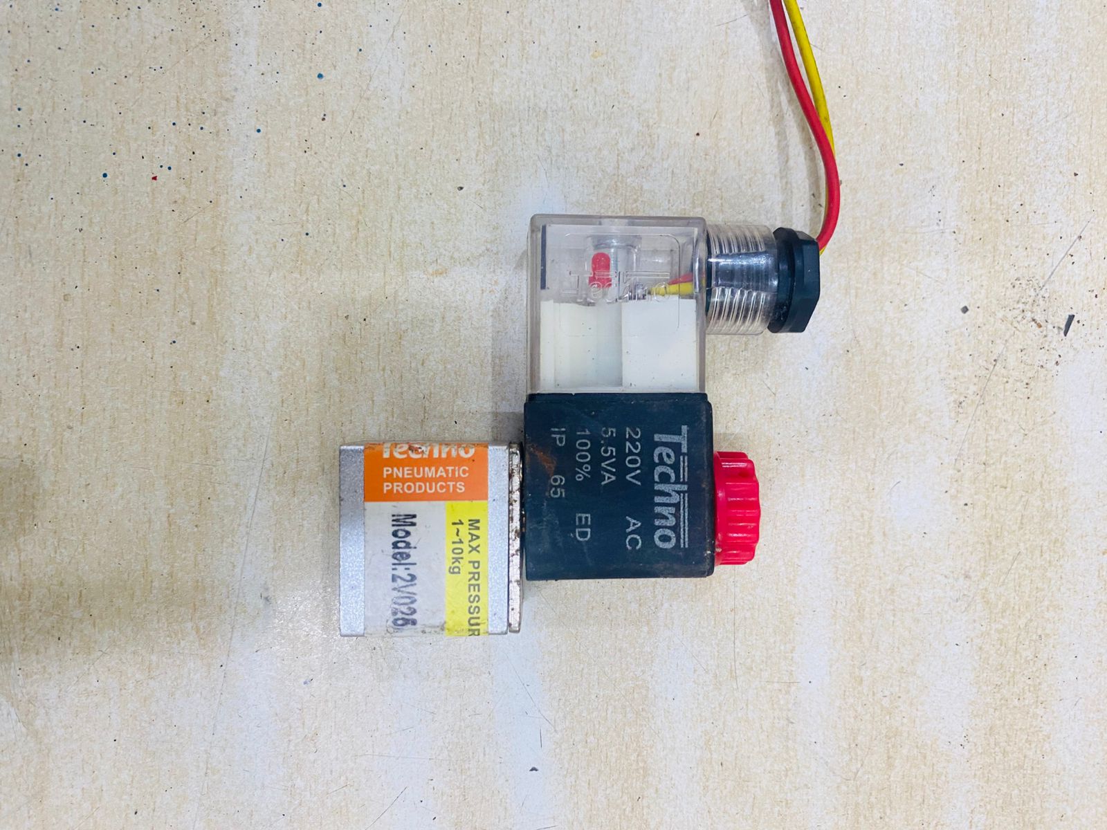 The Techno 2/2 Way Direct-Acting Pneumatic Solenoid Valve (Model 2V025-06) operates at 220V AC with a maximum pressure of 1–10 kg. Designed for precise pneumatic control in industrial automation and fluid systems.